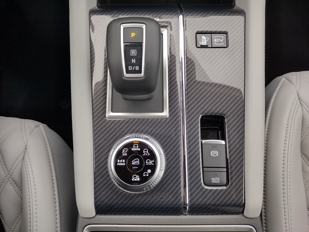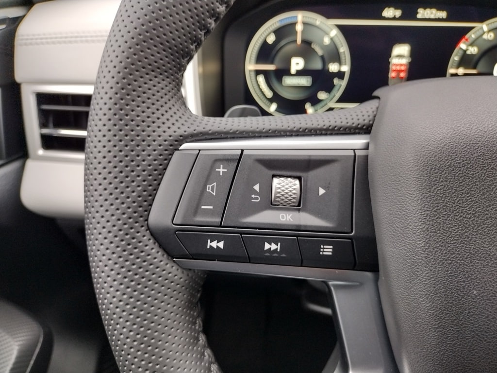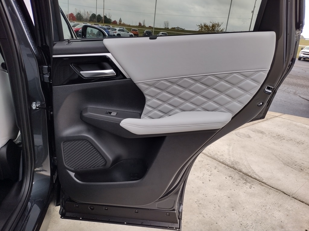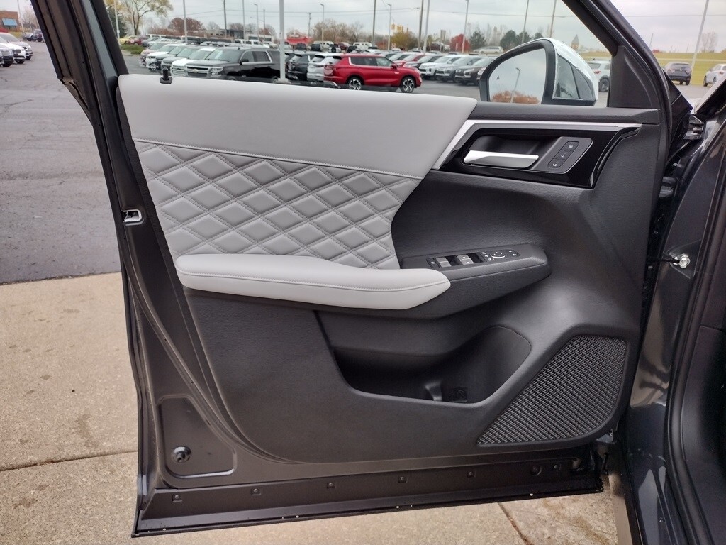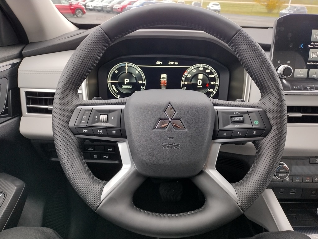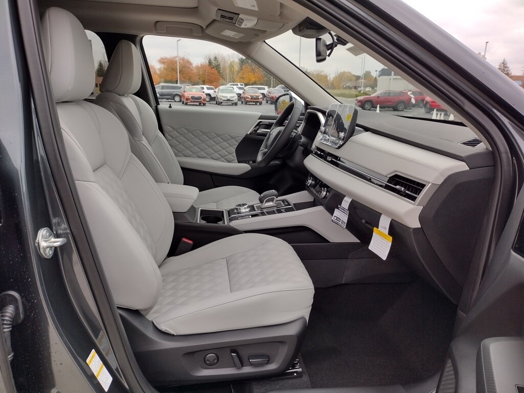 The interior offers leather-appointed seating for seven, heated front and rear seats, 8-way power front seats with driver memory, a heated leather steering wheel, and 40/20/40 split second-row seating. Technology includes a 12.3-inch digital driver display, 9.0-inch navigation with wireless Apple CarPlay, Android Auto, Bluetooth, HD Radio, a wireless charger, USB-A/USB-C ports, tri-zone climate control, FAST-Key with push-button start, Mitsubishi Connect services, a multi-view camera, and multiple drive modes.