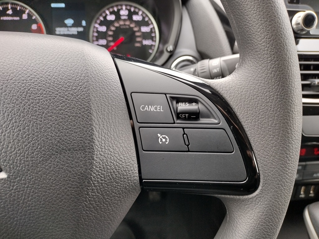 The interior offers heated front seats, fabric upholstery, an 8-inch Smartphone-link Display Audio system with Apple CarPlay and Android Auto, SiriusXM trial, Mitsubishi Connect, FAST-Key entry, and remote keyless entry. Safety features include Forward Collision Mitigation with pedestrian detection, Lane Departure Warning, Automatic High Beam, Rear Seat Alert, LATCH, and seven airbags. EPA rating is 25 city/26 highway MPG, and total MSRP is $32,255.