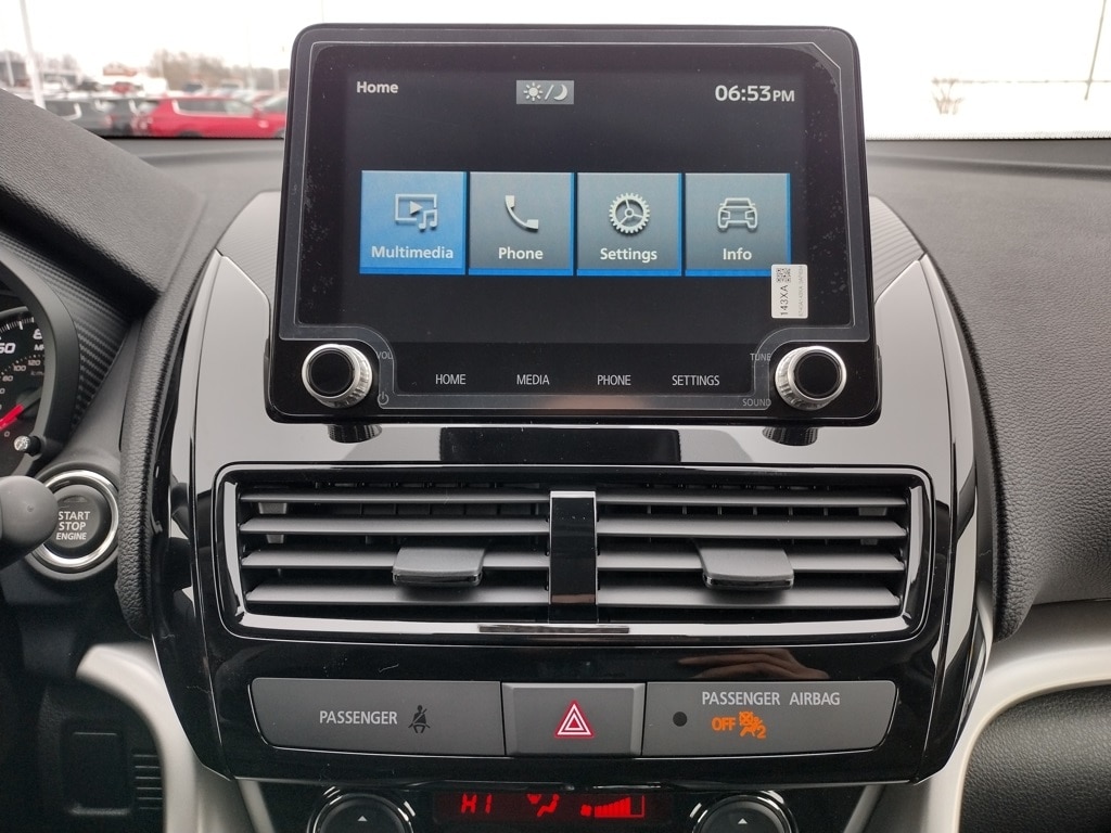 The interior offers fabric seating surfaces with heated front seats, a 6-way adjustable driver seat, and a 4-way adjustable front passenger seat. Technology and convenience features include an 8.0-inch Smartphone-Link Display Audio system with Apple CarPlay and Android Auto, SiriusXM with a 3-month trial, Mitsubishi Connect with trial services, remote keyless entry, FAST-Key entry system, S-AWC drive mode selector, and a four-speaker audio system.