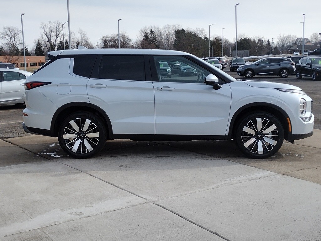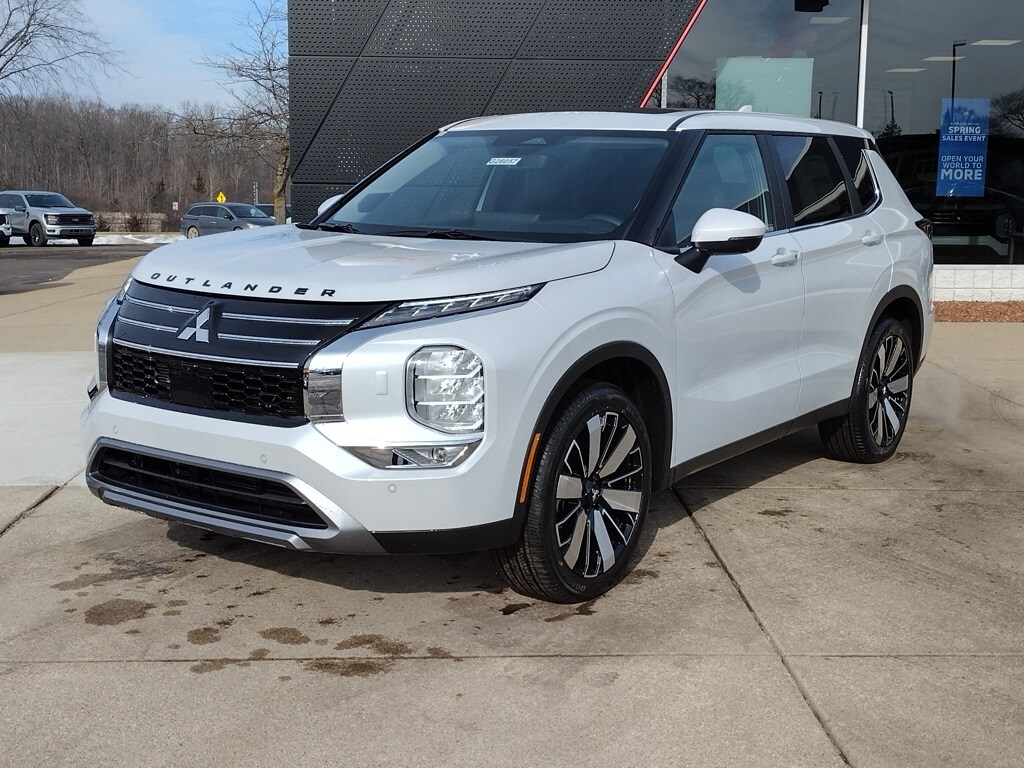Diamond White 2026 Mitsubishi Outlander SE Tech Package 4WD CVT 1.5L I4 Turbocharged DOHC 16V LEV3-SULEV30 174hp 4WD, 12.3" Digital Driver Display, 3rd row seats: split-bench, Accessory All-Weather Floor Mats, Accessory Black Hood Badge, Accessory Grille Paint Protection Film, Accessory Reversible Cargo Mat, Accessory Scuff Plates, Accessory Tonneau Cover, Android Auto & Apple CarPlay, Auto High-beam Headlights, Auto-dimming Rear-View mirror, Automatic temperature control, Dynamic Sound Yamaha Ultimate, Emergency communication system: Mitsubishi Connect w/ 24-month trial, Exterior Parking Camera Rear, Front dual zone A/C, Fully automatic headlights, Garage door transmitter: HomeLink, Heated door mirrors, Heated Front Bucket Seats, Navigation System, Power Liftgate, Power Panoramic Sunroof, Radio: AM/FM 12.3" Navigation with Smartphone-Link, Rain sensing wipers, Reclining 3rd row seat, Remote keyless entry, SE Tech Package, Speed-Sensitive Wipers, Split folding rear seat, Synthetic Leather Seating Surfaces, Welcome Package, Wheels: 20" Two-Tone Alloy.