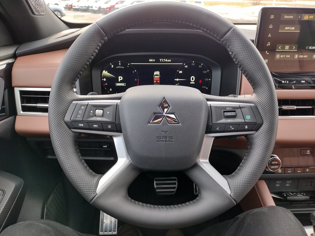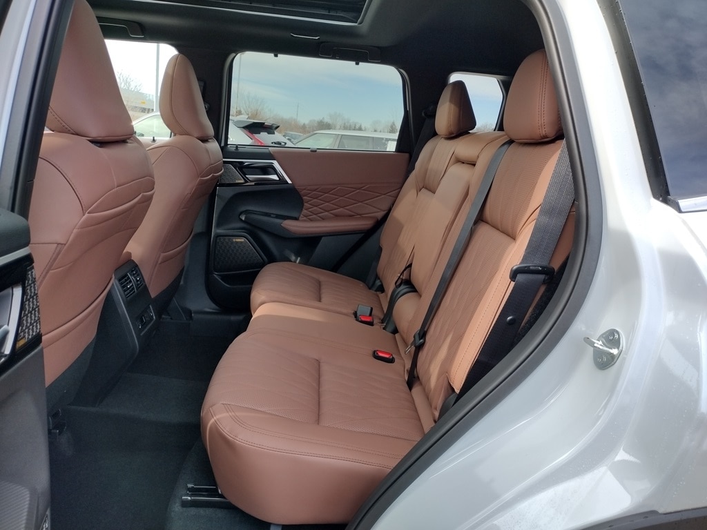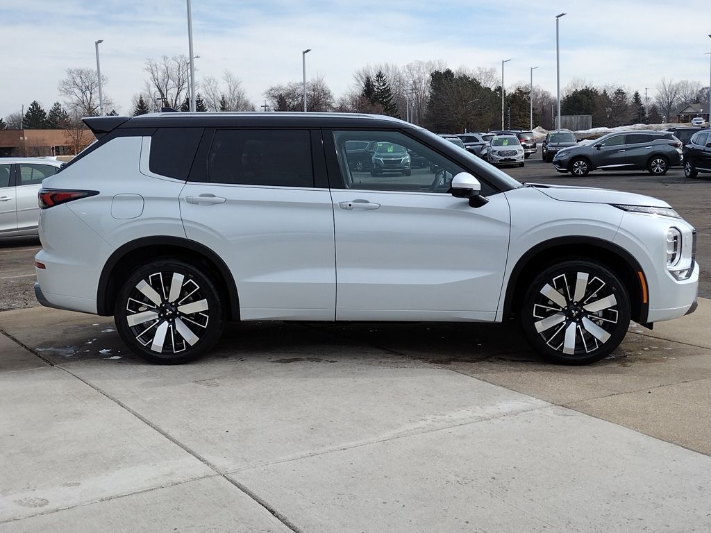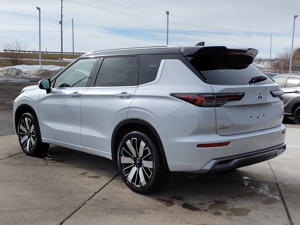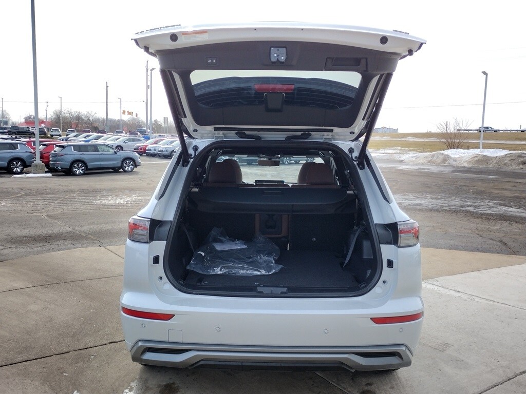 The 2026 Mitsubishi Outlander SEL 1.5T S-AWC is equipped with a 1.5-liter turbocharged 4-cylinder engine, continuously variable transmission, and Super All-Wheel Control. It features LED lighting, 20-inch two-tone alloy wheels, a hands-free power liftgate, and a panoramic sunroof, finished in White Diamond with a Black Roof.