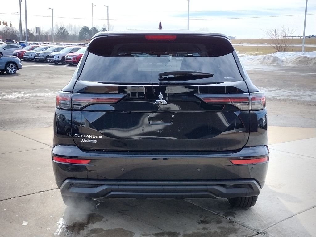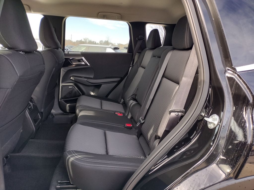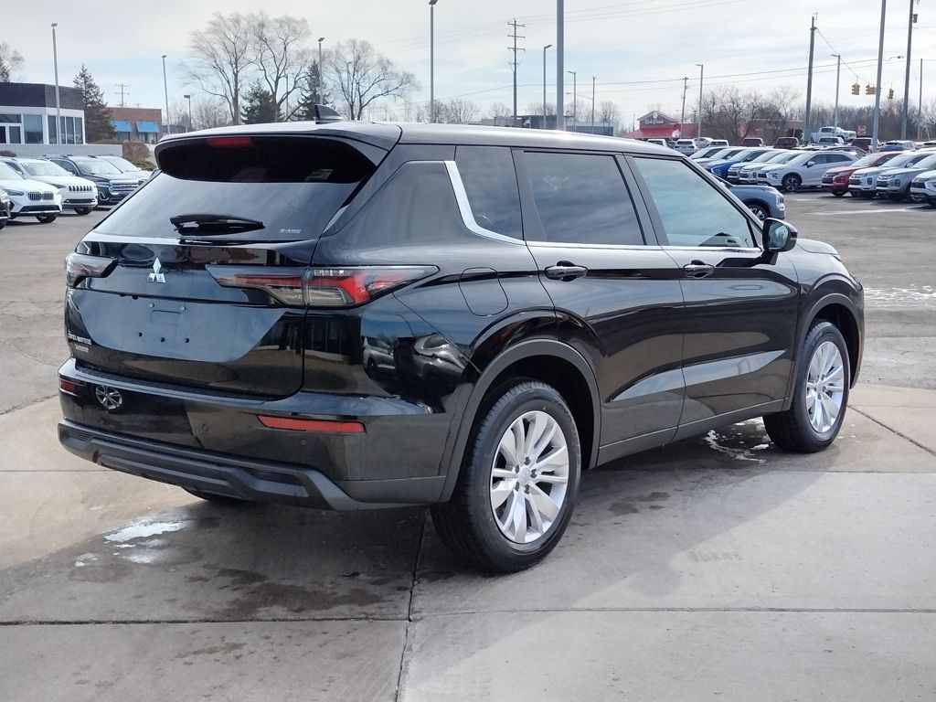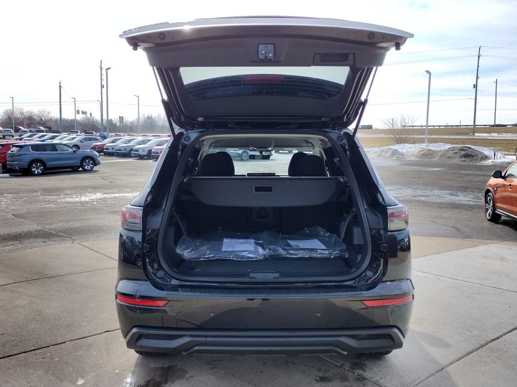 Safety features include Forward Collision Mitigation with pedestrian detection, Blind Spot Warning with Lane Change Assist, Rear Cross Traffic Alert, Rear Automatic Emergency Braking, Driver Attention Alert, Tire Pressure Monitoring System with tire fill notification, LATCH system for the second row, rear seat alert, and 11 airbags. Additional equipment includes Mitsubishi Motors Confidence coverage with a 10-year/100,000-mile limited powertrain warranty, 5-year/unlimited-mile roadside assistance, and 2-year/30,000-mile limited maintenance, along with Mitsubishi Connect trial services. Dealer-installed options include a black rear bumper protector, tonneau cover, chrome hood emblem, welcome package, and all-weather floor mats. EPA fuel economy is rated at 26 MPG city, 30 MPG highway, and 27 MPG combined, with a total MSRP of $34,435.
