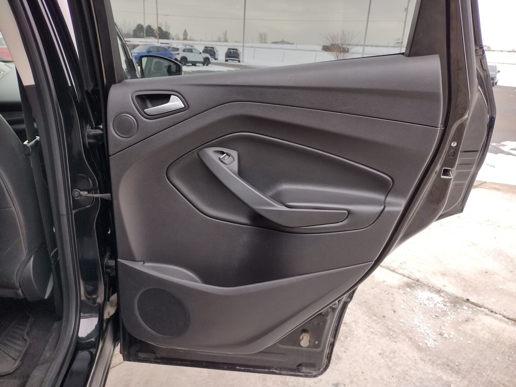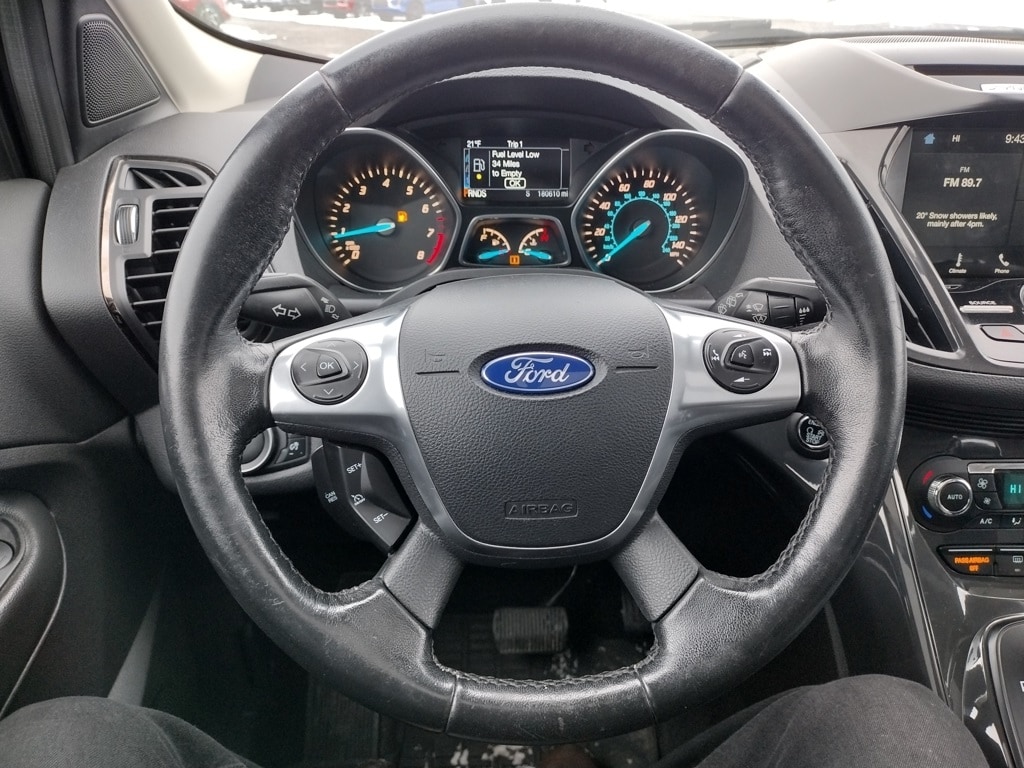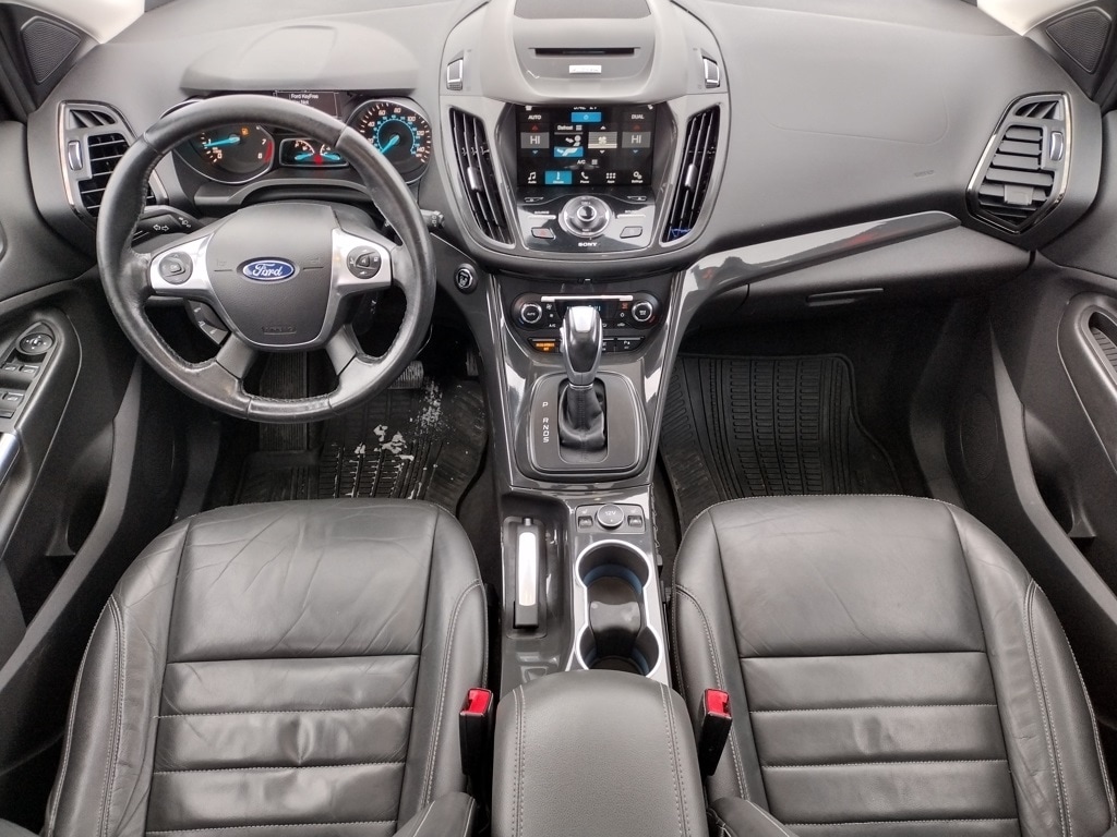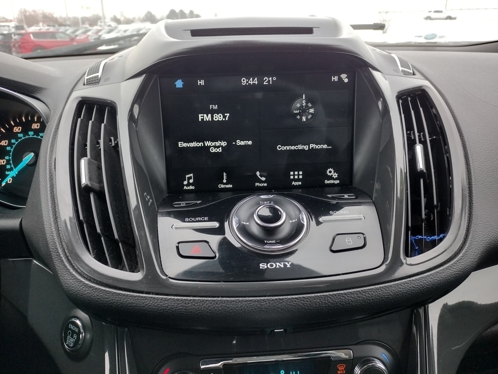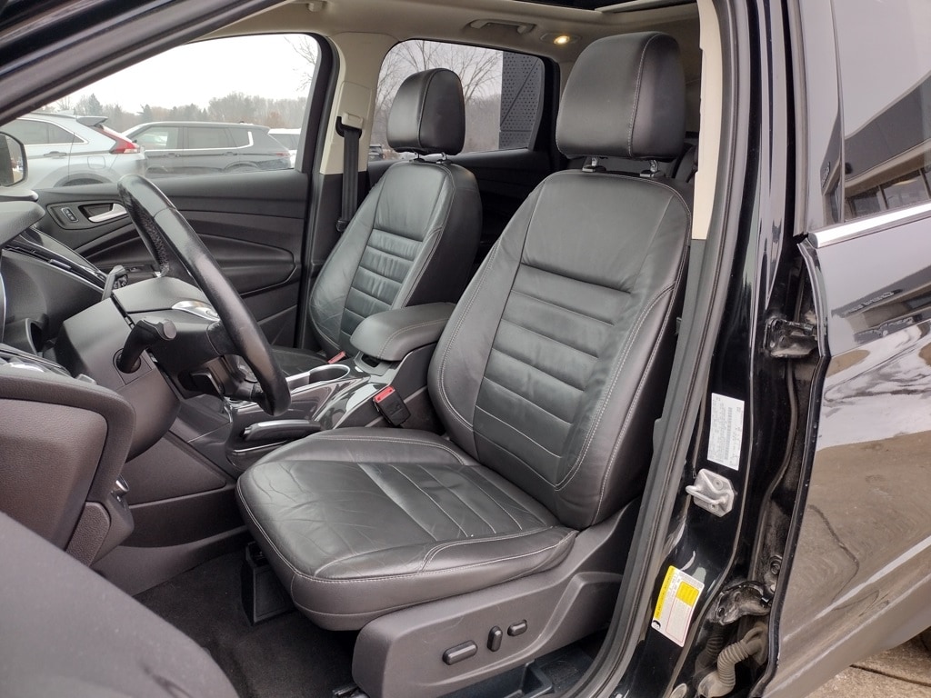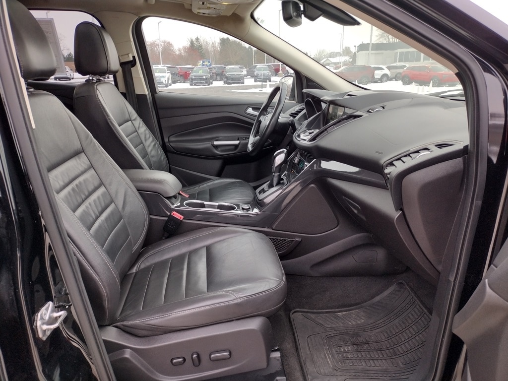 2016 Ford Escape Titanium Leather-trimmed seats, Ambient interior lighting, Dual illuminated vanity mirrors, Auto-dimming rearview mirror, 10-way power driver and passenger seats, Leather-wrapped steering wheel and shift knob, Sony premium audio system (10 speakers), Intelligent Access with push-button start, Remote Start System, MyFord Touch with 8" touchscreen, SYNC 3 infotainment system, Rearview camera, Dual-zone automatic climate control, Power windows and power locks, Power liftgate, Universal garage door opener, SiriusXM satellite radio capability, Panoramic Vista Roof, Trailer Towing Package (Class II), AdvanceTrac with Roll Stability Control, Driver, passenger, front seat-side, and side-curtain airbags, Safety Canopy airbag system, Personal Safety System, Perimeter alarm, Illuminated entry, Tire Pressure Monitoring System, HID automatic headlamps, Blind Spot Information System (BLIS), Active Park Assist, 18" sparkle nickel-painted aluminum wheels