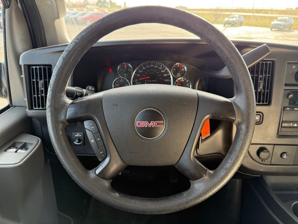 2016 GMC Savana 2500 Cargo Van Heavy-duty 6-speed automatic transmission, Designed for cargo capacity and towing, Full-Size Cargo Van, Regular Body Length,Vinyl or cloth front bucket seats, Rubberized vinyl floor covering, Air conditioning, Power windows and power locks (if optioned), AM/FM stereo (or AM/FM with AUX input), 12V power outlet, Keyless entry, Cruise control, Cargo tie-down hooks, Rear cargo lighting, Driver information center, No rear seating (cargo application), Sliding or swing-out side cargo door (varies by option), Dual rear cargo doors, Swing-out rear cargo doors, Swing-out passenger-side cargo door, Halogen headlights, Daytime running lamps, 16-inch steel wheels